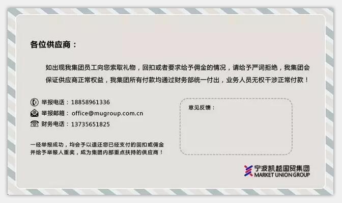 多(duō)年來(lái),集團一直積極倡導并堅持誠信經營。我們嚴禁任何員工以工作(zuò)為(wèi)由,利用職務之便,向供應商“吃(chī)、拿(ná)、卡、要”,一經發現必将嚴肅處理(lǐ)。我們會(huì)認真核實舉報內(nèi)容,一經舉報成功,均會(huì)予以退還(hái)已經支付的回扣或傭金并給予舉報人(rén)重獎,成為(wèi)集團內(nèi)部重點扶持的供應商。