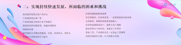 我們今年想做(zuò)一些(xiē)系統的優化和(hé)提升,包括怎麽去用一些(xiē)小(xiǎo)工具來(lái)提高(gāo)效率。我跟湯總也在聊,我們是不是可(kě)以把這些(xiē)好的産品團隊去做(zuò)一些(xiē)工廠的嘗試,收購一些(xiē)工廠。因為(wèi)我覺得(de)工貿也是我們可(kě)以取得(de)發展的一個(gè)路徑。 我認為(wèi)美國市場(chǎng)有(yǒu)很(hěn)大(dà)的潛力,你(nǐ)隻想通(tōng)過某個(gè)單一市場(chǎng)獲得(de)增長挺難,去年我跟市場(chǎng)部的同事一起出國,她們歐洲去了三趟,美國去了一趟。今年我叫她們美國去五趟,歐洲隻去一趟。歐洲的生(shēng)意增長太慢、産出太低(dī)了,反而美國是一個(gè)産出比較快的市場(chǎng)。所以大(dà)家(jiā)都在想怎麽把美國市場(chǎng)做(zuò)大(dà)。我們之前也嘗試過去美國招一些(xiē)美國人(rén)做(zuò)銷售或者組團隊,今年也在想能不能在美國成立公司,或者找一些(xiē)合夥人(rén)直接做(zuò)美國大(dà)的零售。