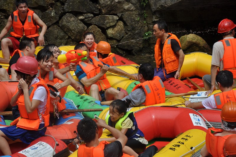 中飯過後,稍作(zuò)休整。1點半的漂流活動提上(shàng)議程。大(dà)家(jiā)自願組成2人(rén)隊伍,穿上(shàng)救生(shēng)衣,帶上(shàng)安全帽,坐(zuò)上(shàng)橡皮艇,實乃整裝待發。漂流的第一環節——打水(shuǐ)仗。平時(shí)文靜的同事們現在可(kě)不淡定了,有(yǒu)了明(míng)确目标,二話(huà)不說,直接潑水(shuǐ)。有(yǒu)的同事還(hái)沒反應過來(lái),便已被“攻擊”,小(xiǎo)則全身濕透,小(xiǎo)艇進水(shuǐ);大(dà)則直接翻船(chuán),所謂的人(rén)仰馬翻。驚呼聲、求饒聲不斷……漂流第二環節——開(kāi)閘放水(shuǐ)漂流。壽仙谷漂流全程約3公裏,總體(tǐ)落差70餘米,落差位有(yǒu)40餘處。峽谷河(hé)道(dào)曲折蜿蜒,平穩處忽轉忽旋,順流而下;落差處疾馳而下,大(dà)浪撲面,好不刺激。有(yǒu)幾處都不敢睜眼看,直接閉着眼睛沖擊而下,接受大(dà)浪的“洗禮”。途中也有(yǒu)被阻現象,适當會(huì)有(yǒu)相應工作(zuò)人(rén)員給予幫助。待到終點,同事們直呼好玩刺激,不虛此行(xíng),更有(yǒu)的同事報告說鞋子、眼鏡都被沖走了,我們笑言他們給壽仙谷留下了小(xiǎo)紀念品。