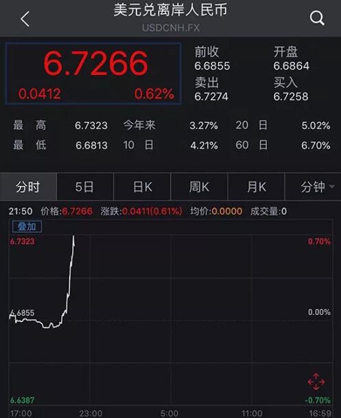受此影(yǐng)響,在岸人(rén)民币兌美元收複6.7關口,短(duǎn)線拉升近300點。離岸人(rén)民币兌美元短(duǎn)線拉升超200點至6.7080。